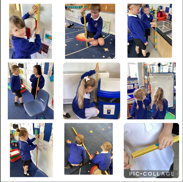 We have been measuring using standard units of measure. We began by finding items in our classroom that were taller, longer and shorter than a metre. As a challenge we then found things that were taller, longer and shorter than half a metre. Finally we found objects that were taller, longer and shorter than a quarter of a metre.