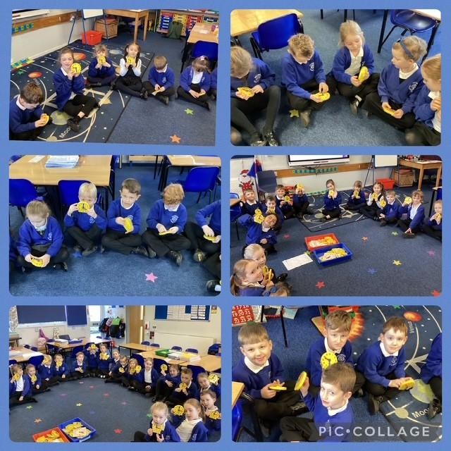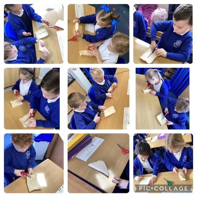 We have been learning about halves and to investigate making halves, we have used a piece of bread to see how many ways we can get two equal sized pieces.