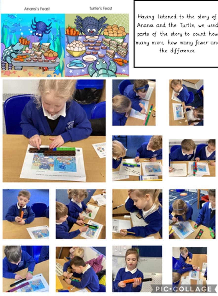 Having listened to the story of Anansi and the Turtle, we used parts of the story to count how many 'more', how many 'fewer' and the 'difference'.