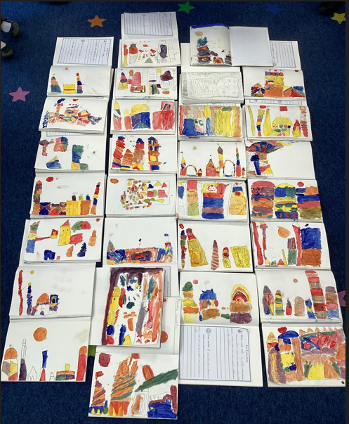The children started drawing their art using a variety of shapes. We then used primary colours to start with and mixed these to create secondary colours. We are all so proud of the artwork created!