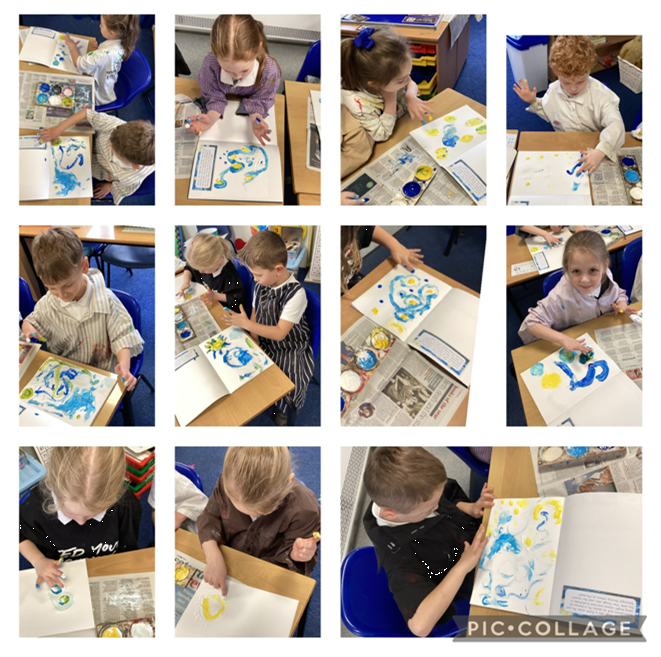 We used a range of colours and mixed paint and cornflower to have a go at the impasto technique in the style of Vincent Van Gogh.