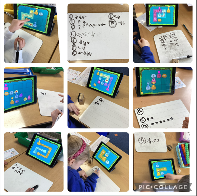 In computing we discussed where we use algorithms in everyday life. Although we don’t call them algorithms, we use them all of the time when cooking, for example when following a recipe. Our adults may regularly following ‘route algorithms’ on phones and sat-navs too. We then used a path puzzler app to investigate route algorithms We had to work together to get the ‘most precise’ route. We drew arrows on a whiteboard to show the different ways of getting, for example, the brown dog to the brown bone. We also had to ‘debug’ some of our routes, as the paths could not cross!