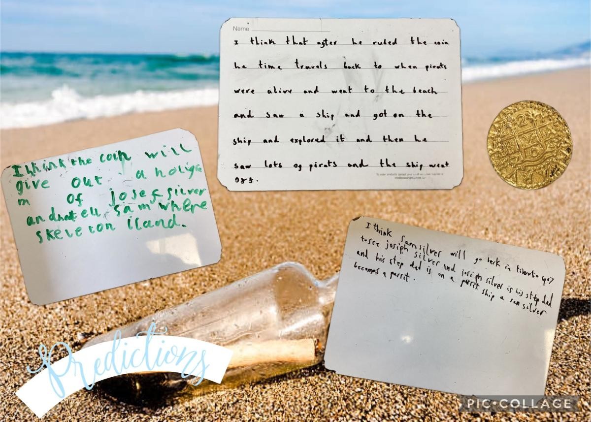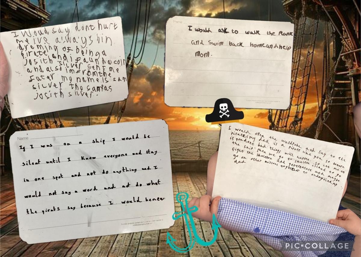 This week, we weighed anchor and read the first chapter, right up to the part where young Sam be discoverin’ a mysterious message in a bottle from the legendary Joseph Silver himself! Alongside the note – a gleamin’ golden doubloon! Our young shipmates made their predictions—what be happenin’ if Sam dared rub the shiny coin? With much excitement, we read on and shivered our timbers when we found out Sam had been whisked back in time onto a real pirate ship! We then shared what we’d do if we were thrown back through time and came face to face with a band o’ fearsome pirates! Let’s just say—we’ve got some brave buccaneers aboard this Year 2 crew!