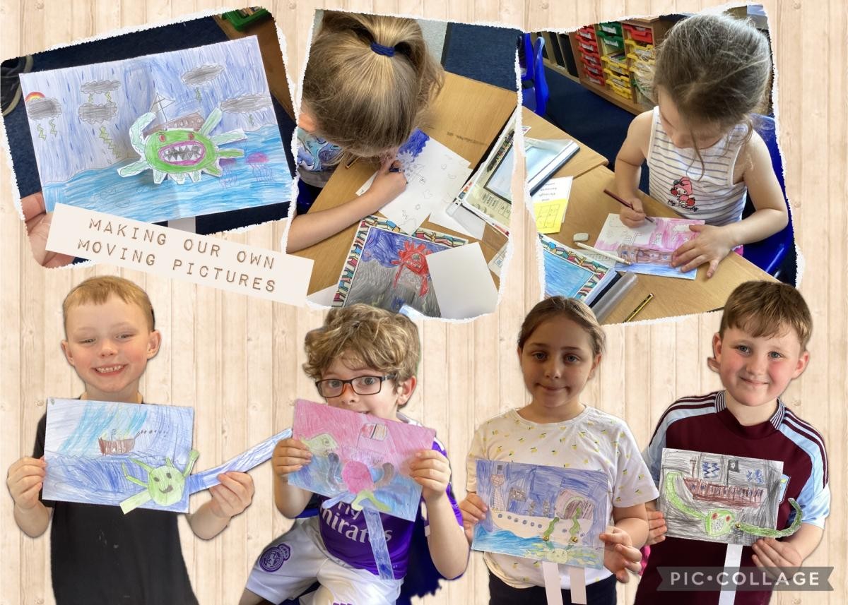 This half term in Design and Technology, we’ve had an exciting time exploring the world of moving pictures! After diving into books with interactive elements, we got hands-on and began experimenting with mechanisms ourselves. We started by creating slider mechanisms to recreate a classic scene from The Gingerbread Man – it was a great way to learn how pictures can come to life through simple movement. Next, we moved on to levers and pivots, using them to craft a picture of a ship rocking in the sea. It was fascinating to see how a few simple materials could create such realistic motion! To finish, we let our imaginations set sail and created our own pirate-themed moving pictures. Some featured a mighty kraken rising from the depths, while others showed a hard-working pirate swabbing the deck. What a lot of fun we had while learning about mechanisms and storytelling through movement!