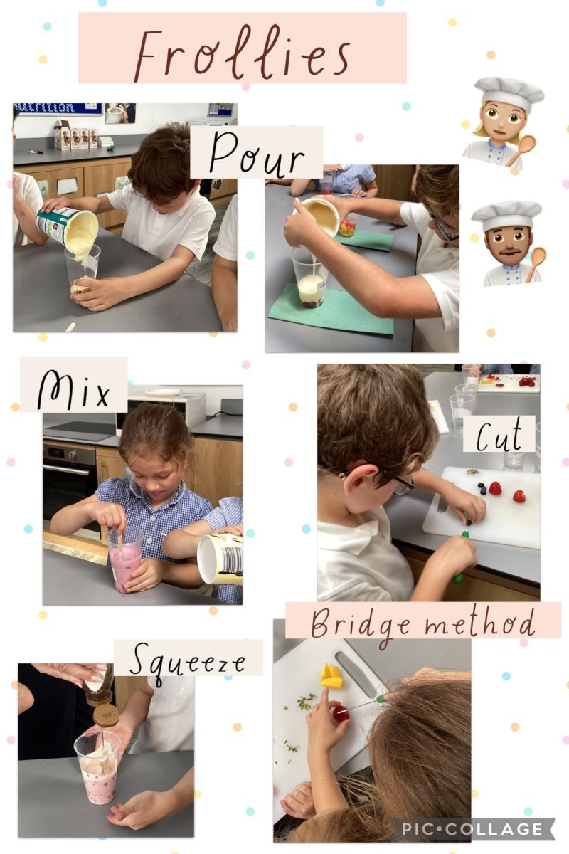 This half term in DT, Year 2 have been busy making frollies! They’re not quite fruit and not quite lollies – they’re something in between... frollies! We began by tasting lots of different fruits and choosing our favourite flavours. Then we carefully chopped the fruit using the claw and bridge method, mixed it with yoghurt and a little honey, and popped our frollies into the freezer. The best part? Eating them! We all agreed they were absolutely delicious!