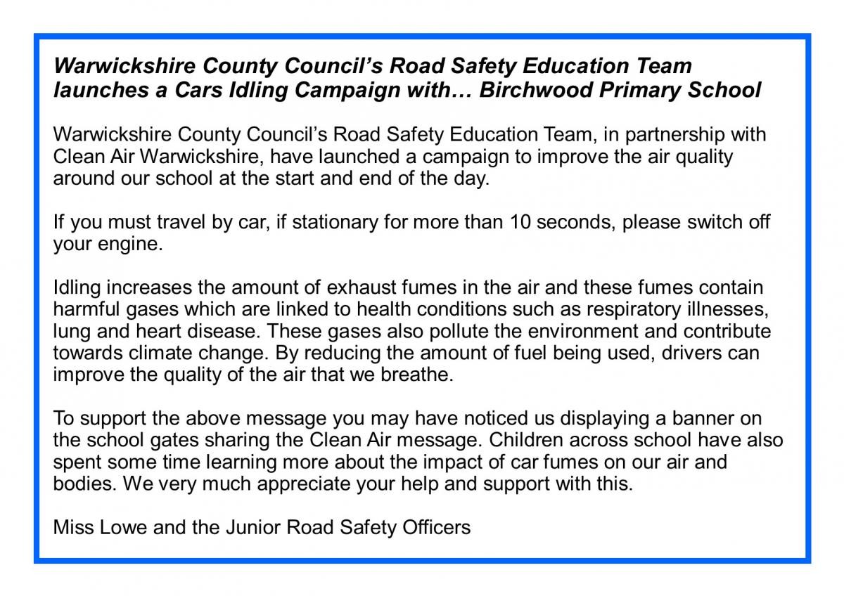 We are extremely proud to be working with Warwickshire Road Safety, supporting their 'Kids need clean air' campaign. As you approach the school gates you will see a banner highlighting this important message and all children should have come home with a Clean Air bookmark this week.