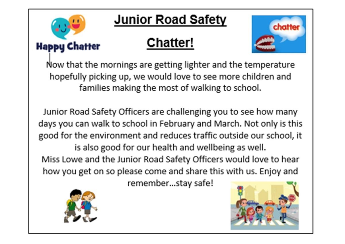 Junior Road Safety Officers will be supporting this within school, encouraging their peers to walk where they can and we will also be collecting data within Maths Meetings to measure how many children walk to school across the week. We would really appreciate your help and support with walking to school where you can and increasing the message of road safety.